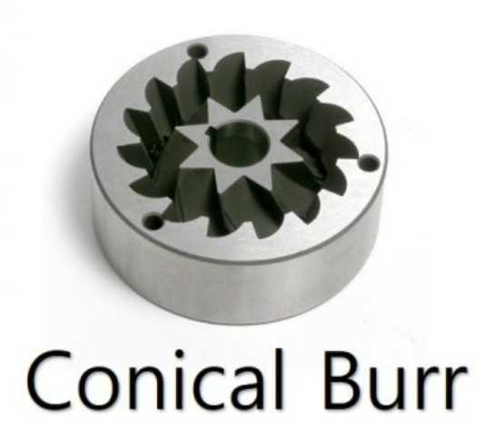 수동식 그라인더와 전동식 그라인더 방식에 모두 사용됩니다. 고정되어 있는 암날 안으로 숫날이 회전하여 들어가 분쇄합니다. 전동식 그라인더는 분당 400~600 rpm 정도 저속으로 회전하여 마찰열 발생이 적다는 장점이 있지만 분쇄된 커피 입자가 플랫 버에 비해 고르지 못하다는 단점이 있습니다.